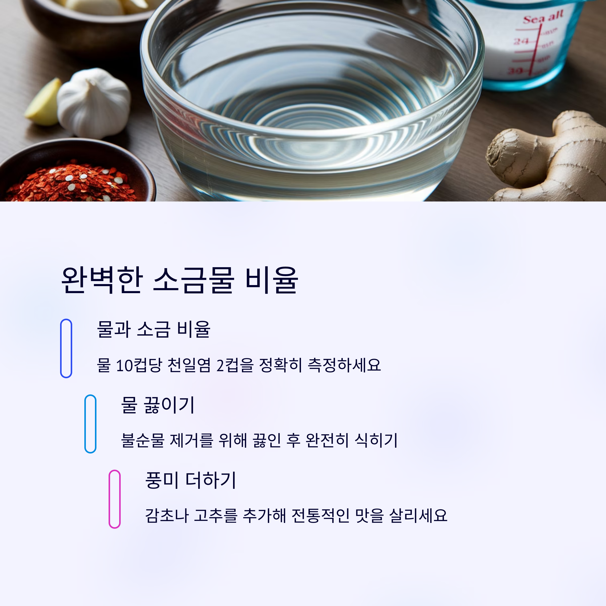 | 밀폐 보관하고 비닐 커버를 덧대면 위생적으로 좋아요. | 물 10L에 소금 1.5컵 비율이 가장 적당합니다. | 다진 마늘, 고춧가루, 참기름 넣으면 풍미가 UP! |