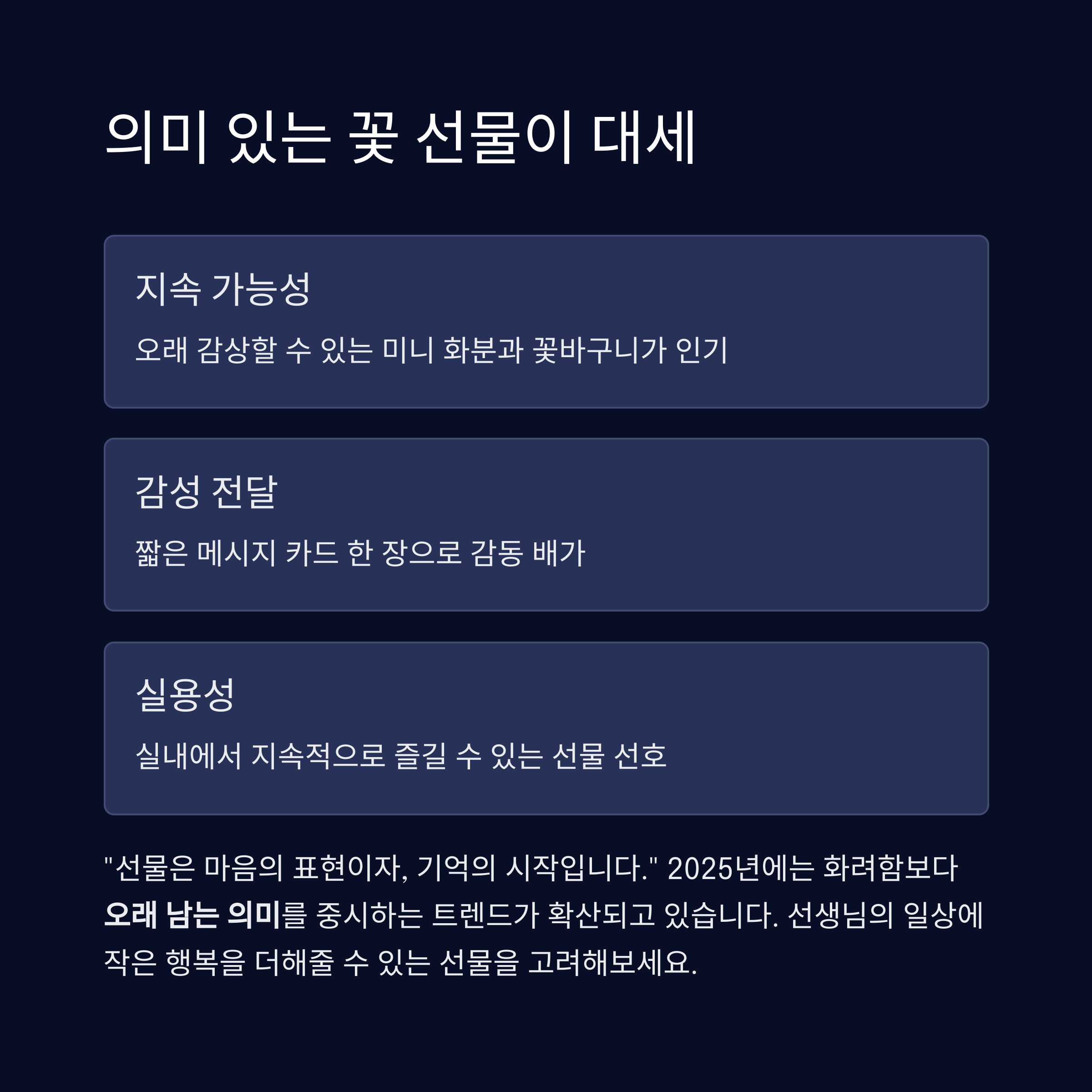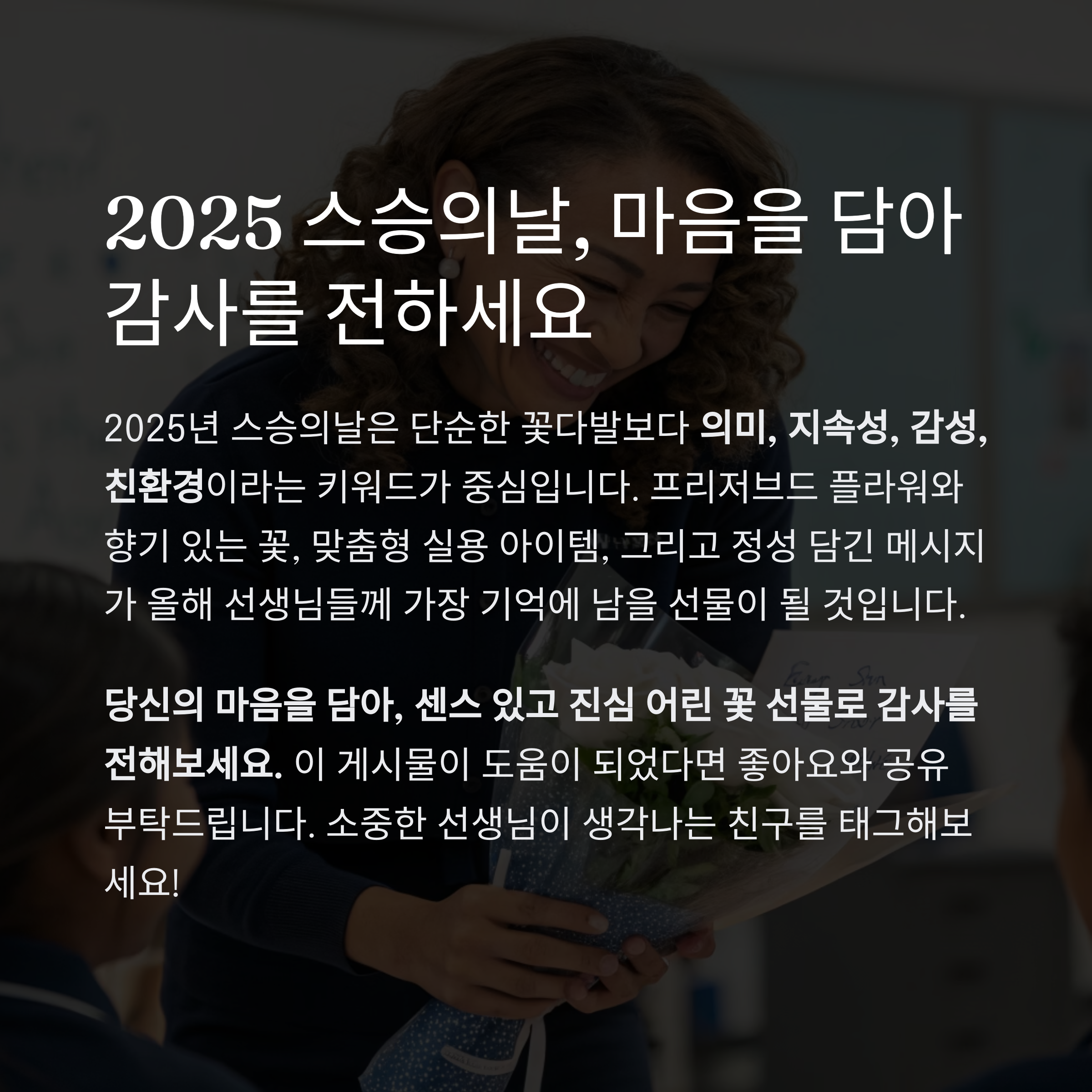 2025년 스승의날은 단순한 꽃다발보다 의미, 지속성, 감성, 친환경이라는 키워드가 중심입니다.