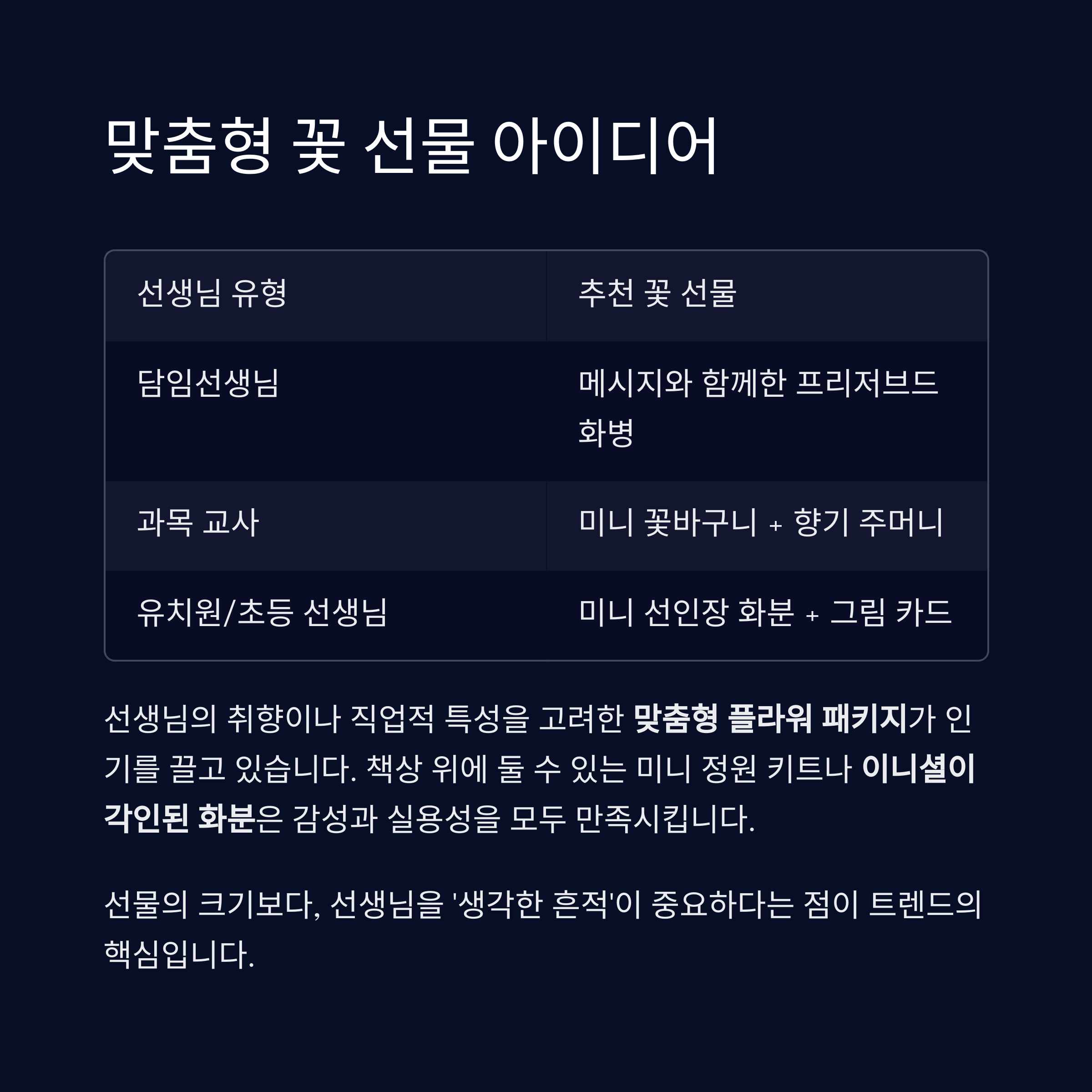 선물의 크기보다, 선생님을 ‘생각한 흔적’이 중요하다는 점이 트렌드의 핵심입니다.